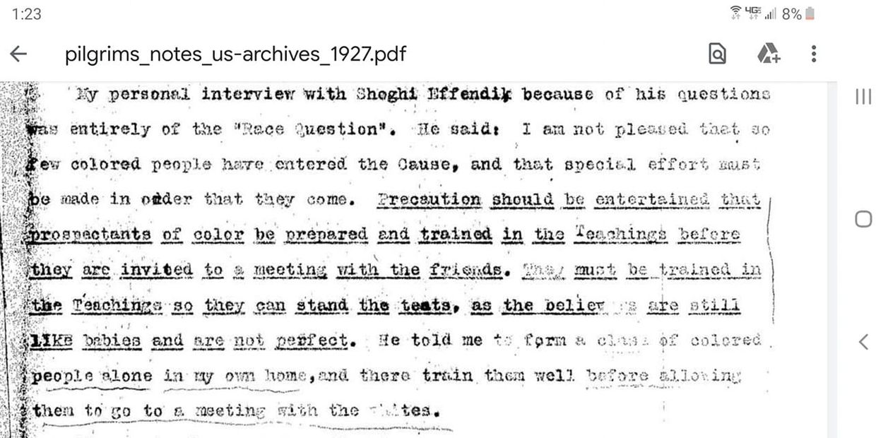 Even with neighborhoods, some will involve an interracial population and others will not. But you should not underestimate the value of contributing to spiritual empowerment and community building in an African American neighborhood where the work of a few dedicated friends can lead to the participation of scores of families—an experience that can itself radically alter and revive a local Bahá’í community that showed no previous capacity to deal with matters of race." (Universal House of Justice to the U.S. National Spiritual Assembly, March 24, 2019)